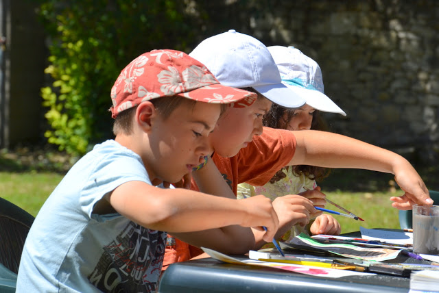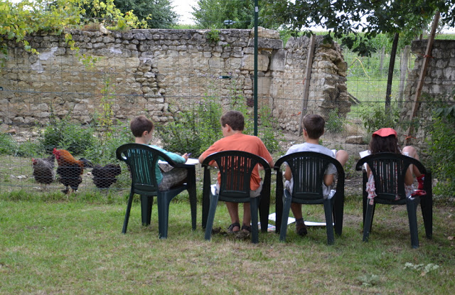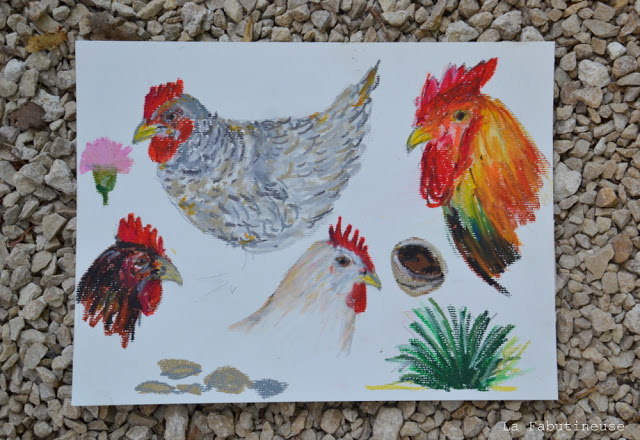 Des poules qui ont pris la pose pour une séance de dessin devant le poulailler. J'en ai profité pour sortir les pastels gras et gribouiller en même temps que les enfants.