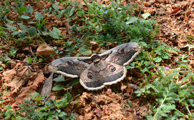 Il se trouve que l'an dernier sur une aire d'autoroute, mon grand bourdon avait trouvé un papillon "grand paon de nuit" mâle (reconnaissable à ses grosses antennes pectinées - celles de la femelle sont plus fines). Il s'était mouillé les ailes et était coincé sur le carrelage du bâtiment de l'aire. Je l'avais pris délicatement dans les mains (c'est très impressionnant car il faisait plus de 10cm) et posé sur des feuilles au soleil pour qu'il se sèche. Un peu plus tard nous l'avons vu s'envoler c'était un moment plein d'émotion. Je peux donc vous montrer les photos du papillon que j'avais prises à ce moment là. Et du dessin que j'ai réalisé.