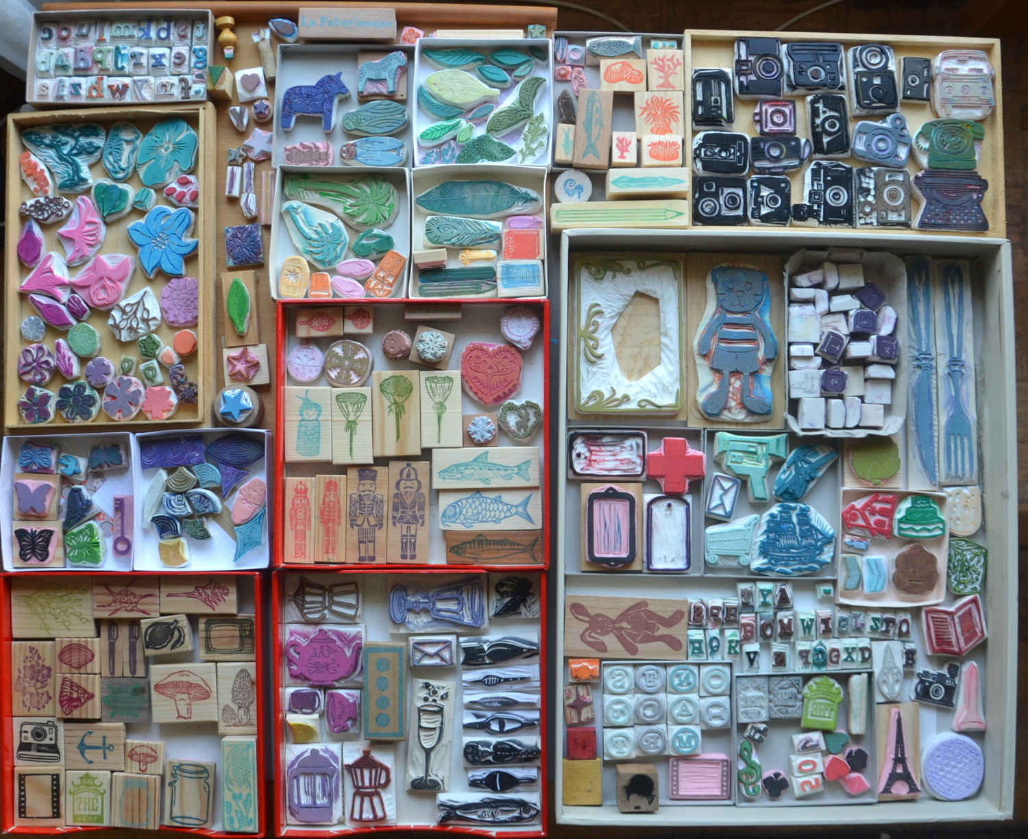 Ces boîtes remplies de tampons me donnent envie!!!! Profite pleinement et prends du plaisir dans ce que tu fais c'est l'essentiel. Pour les logos... j'aurais très certainement besoin de ton talent cette année, puisque un projet me trotte dans la tête pour 2013! Bises! Marlène