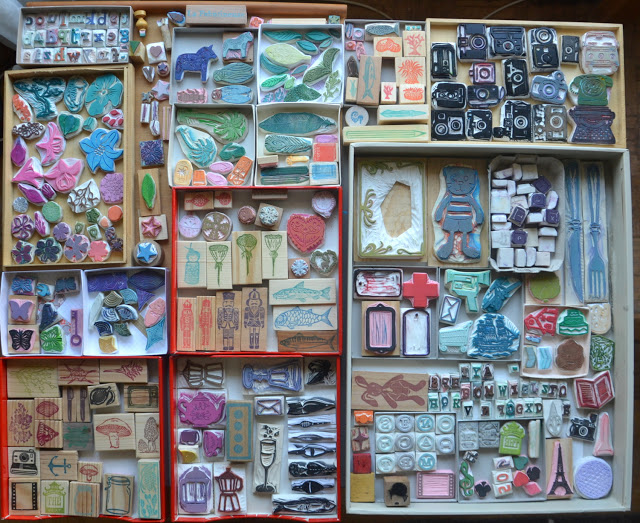 Les réalisations de logo me demandent un investissement en temps important que je n'ai plus ensuite pour le reste. La photo qui illustre cet article représente tous les tampons que j'ai à la maison. Et, vous avez dû le constater, ma boutique est quasi vide. Je n'ai pas eu une seule heure en octobre ou novembre pour l'alimenter en nouvelles créations. Mes impressions botaniques, par exemple, ont été une contrainte que je me suis imposée pour garder du temps de création personnelle. J'ai envie de graver des motifs nouveaux, de refaire des insectes, des papillons, des motifs vintage, de la couture et des nouvelles affiches et plein de nouvelles idées qui ne sortent plus des carnets depuis quelques mois. Que dire des meubles chinés en attente de bricolage dans mon garage... Hum.