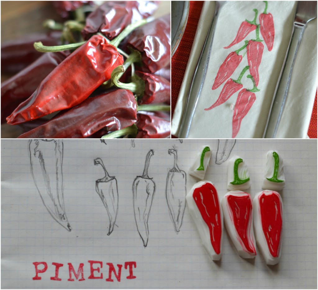 Cela fait quelques semaines, ou mois ? Que j’ai dans ma cuisine une grappe de piments accrochée qui a été achetée spécialement pour me servir de modèle pour des tampons à décliner en linge de table. En attendant de les mettre sur du vrai tissu (serviettes, chemin de table…), j’ai fait une petite déco de table toute simple, pour un dîner à deux. J’ai imprimé les motifs sur les serviettes en papier. Pour donner des idées j’ai aussi fait un petit marque place.