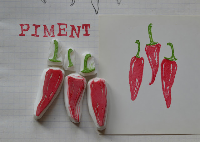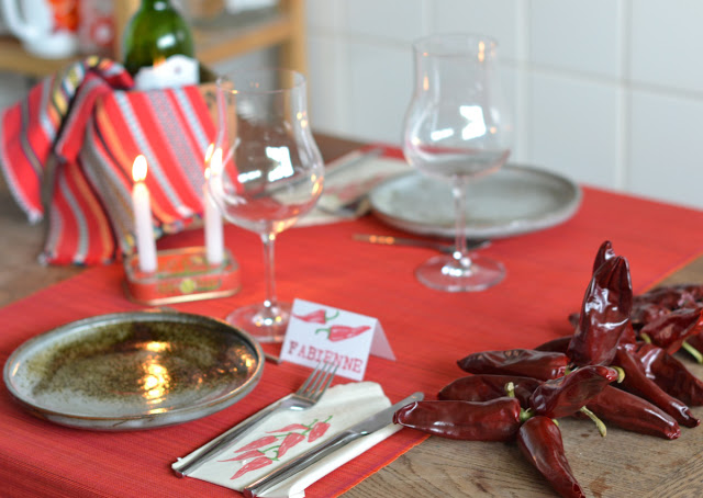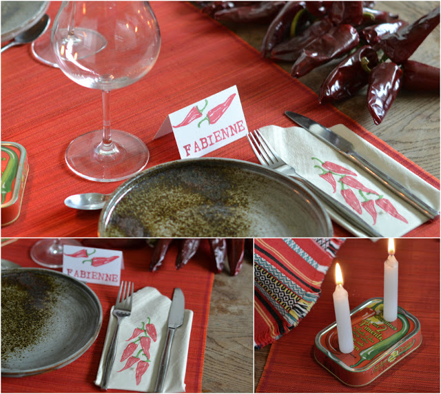 Cela fait quelques semaines, ou mois ? Que j'ai dans ma cuisine une grappe de piments accrochée qui a été achetée spécialement pour me servir de modèle pour des tampons à décliner en linge de table. En attendant de les mettre sur du vrai tissu (serviettes, chemin de table...), j'ai fait une petite déco de table toute simple, pour un dîner à deux. J'ai imprimé les motifs sur les serviettes en papier. Pour donner des idées j'ai aussi fait un petit marque place.