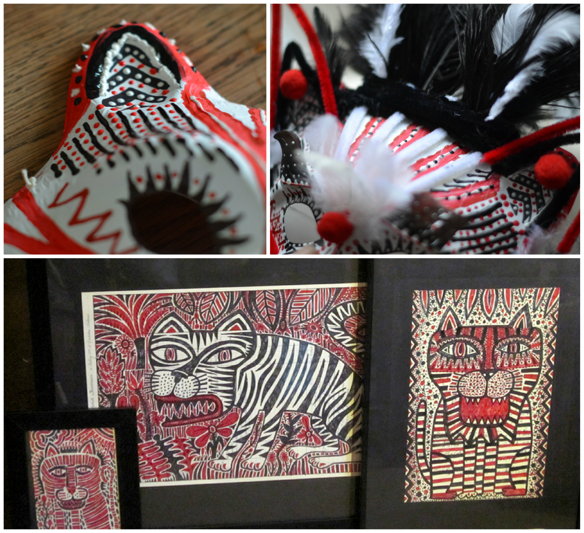 Mon masque s'est inspiré des dessins graphiques du Flibustier. En effet j'ai beaucoup aimé dernièrement sa série de félins en noir, rouge et blanc, qu'il a réalisé pour une exposition.