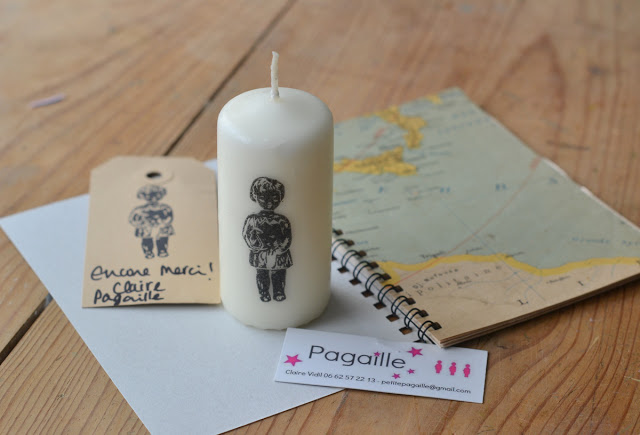 Claire de la petite boutique Pagaille, qui m'avait commandé un tampon, pour sa petite poupée, a noté que j'avais flashé sur la bougie tamponnée, et quelques temps après, je l'ai reçue à la maison. Alors je suis épatatée, car je ne sais quelle encre a été utilisée mais ça ne bave pas, ne bouge pas sur la cire, c'est incroyable. Alors Claire ? c'est quoi ? :) Merci de cette attention.
