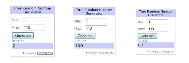 Hier soir les commentaires ont été fermés, comptés, vérifiés. Il y avait 123 commentaires, 5 commentaires non valables (pas de lien ni d'adresse mail) et 5 réponses que j'avais faites pour les avertir de la non validité. Sans réponses ni correction, il restait 113 participants pour le tirage au sort.