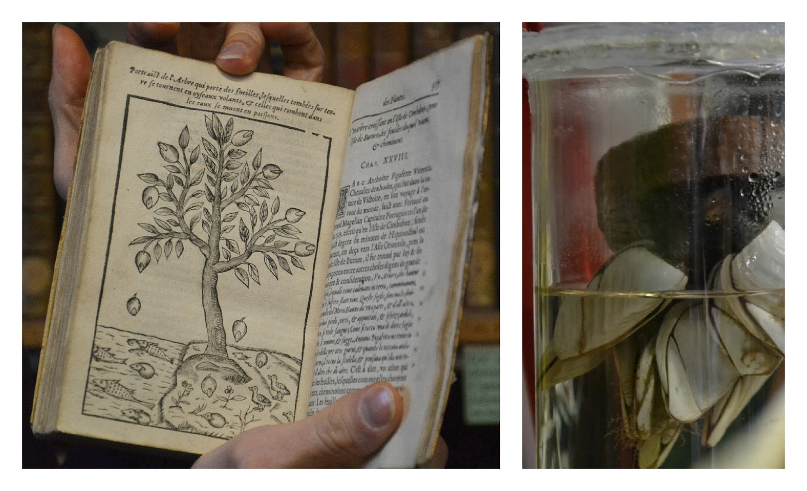 Ce livre s'intitule "Histoires admirable des plantes et herbes esmerveillables et miraculeuses en nature" il date de 1605. Sur la gravure on voit que les fruits tombent soit dans l'eau et se muent en poisson, ou tombent sur le sol et se transforment en oiseaux volants.