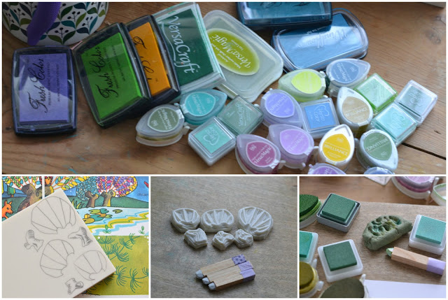 Préparation des encres, je me suis lâchée aussi dans les couleurs ! En bas à droite, la gomme mie de pain dans laquelle je "nettoie" le tampon entre chaque couleur pour ne pas mélanger les couleurs sur les encreurs. Ça m'est arrivé de mettre un tampon joyeusement sur un encreur en oubliant de le faire, youpi les encreurs sont bien massacrés, puisque les couleurs ne sont plus nettes :(