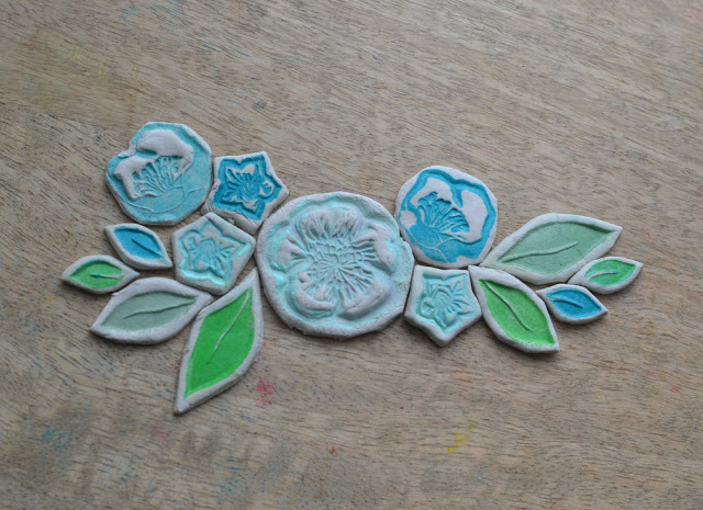 Ceci est la première partie car j'ai une idée en tête pour faire quelque chose, et il me fallait attendre que ça sèche. D'ailleurs, vous feriez quoi vous avec ces petites pièces de pâte dure tamponnée ??