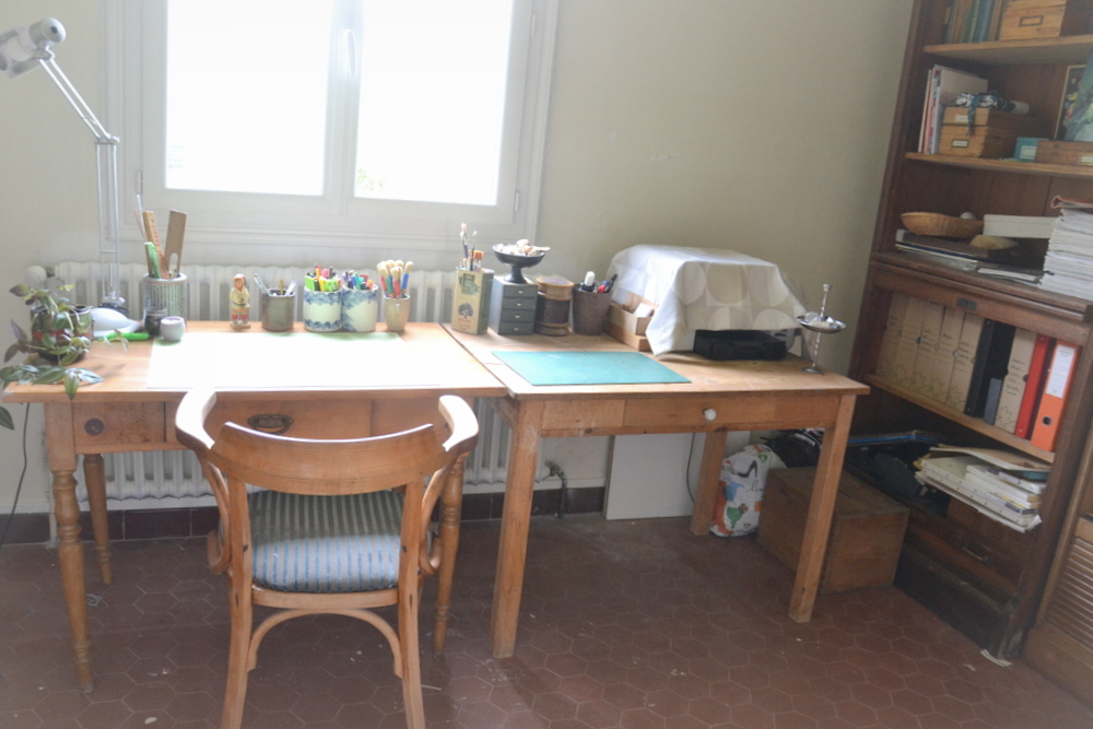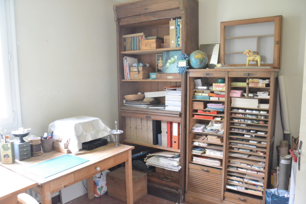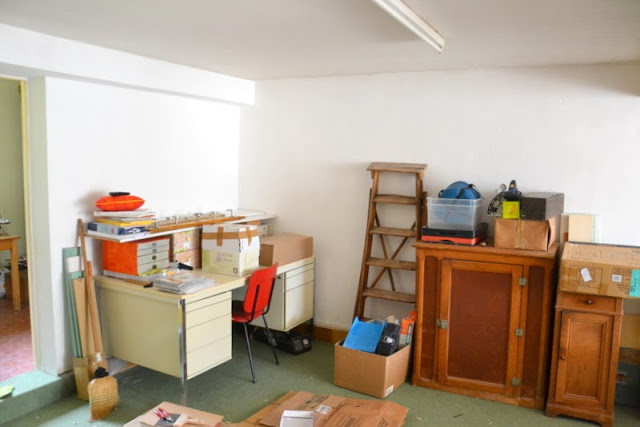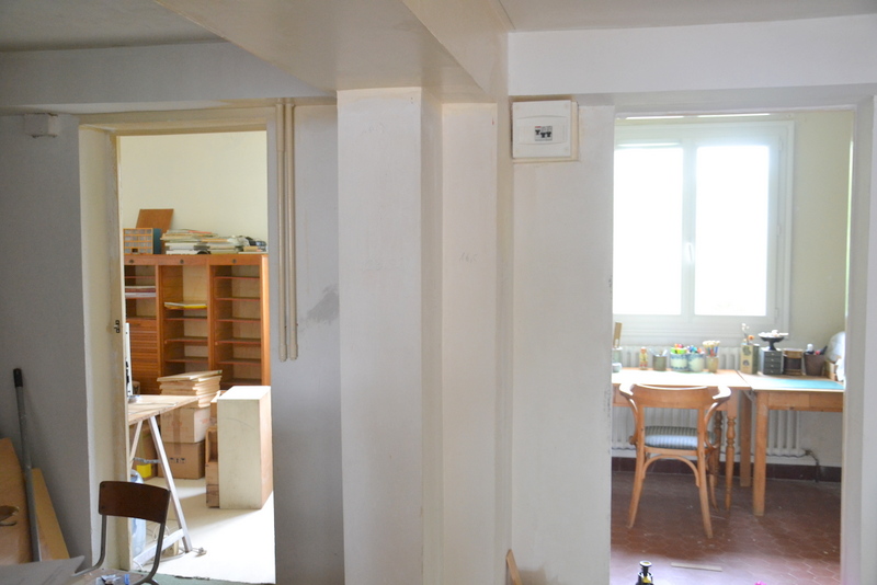 Devant l'atelier, la zone "papiers-papeterie" (massicot, relieuse...) en cours d'installation. Une petite annexe de mon atelier qui accueillera aussi les tissus et le matériel couture.