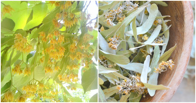 Il y a environ deux semaines, quand il faisait très chaud, je sentais sur le chemin de mon travail des effluves fortes de tilleul. Il y avait un arbre immense en fleurs et j'en ai cueilli un peu en me disant que je testerai la tisane. Au début je voulais faire du sirop de tilleul, mais mon grand adore les tisanes et comme de toutes façon je n'avais pas cueilli assez de fleurs, je les ai fait sécher.