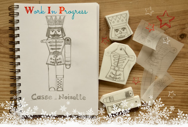 D'abord le début d'un projet que je suis en train de tester. Des petits casse-noisettes articulés, pour accrocher en décoration de noël, dans le sapin ou ailleurs. J'ai fait le dessin, reporté celui-ci sur la gomme et il me reste à le graver et imprimer sur du joli papier avec des encres rouges, argentées ou dorées. Les morceaux s'assembleront avec des attaches parisiennes.