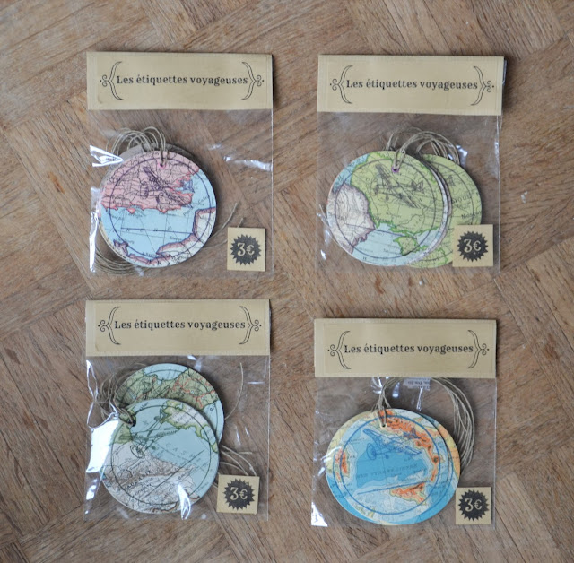 Mes étiquettes réalisées avec des anciens atlas géographiques ont gardé l'idée du voyage comme dans le titre de l'article que j'avais fait sur leur fabrication.