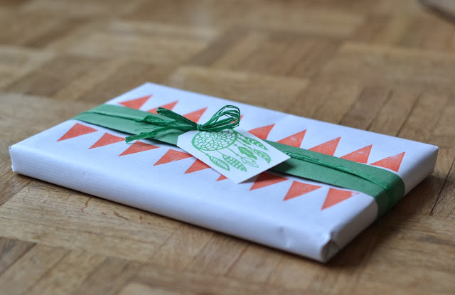 Le tampon se met après avoir emballé le cadeau en papier uni blanc, puis une bande de papier uni vert au centre et les triangles de chaque côté.