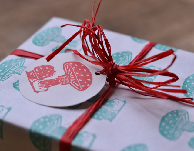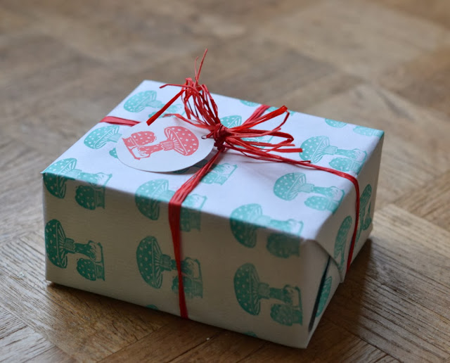 J'ai donc fait pas mal de petites présentations d'exemples d'utilisation, des marques place de table, serviettes décorées, étiquettes, et puis les incontournables emballages cadeaux, faits avec du simple papier kraft de couleur, et des tampons.