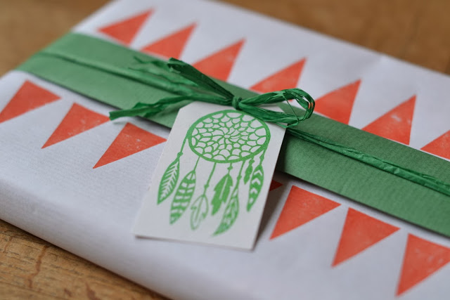 Mon préféré est un emballage très simple, qui peut être fait avec un cutter et une gomme d'écolier. Puisqu'à la base il ne faut qu'une forme de triangle. L'emballage avec ces triangles a des airs amérindien, du coup j'ai accessoirisé avec une jolie étiquette avec un tampon de dreamcatcher ou attrapeur de rêve.