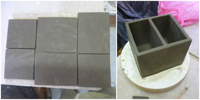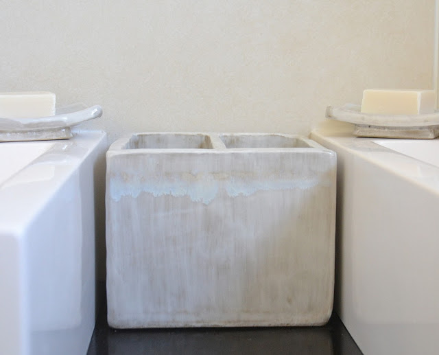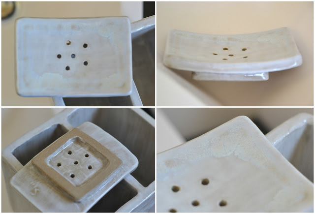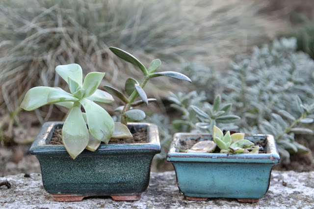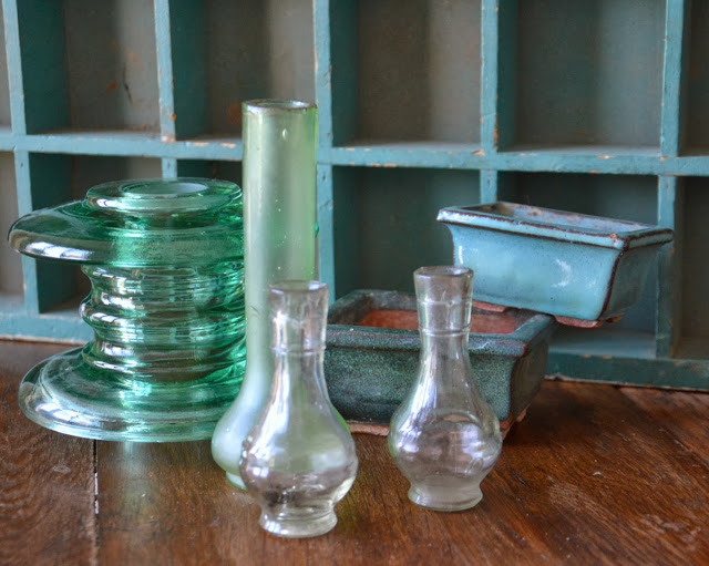 Des petits vases en verre ancien, et un ancien isolateur électrique, que j'utilise en bougeoirs. Des petits pots en terre cuite émaillée pour y mettre mes petites plantes succulentes.