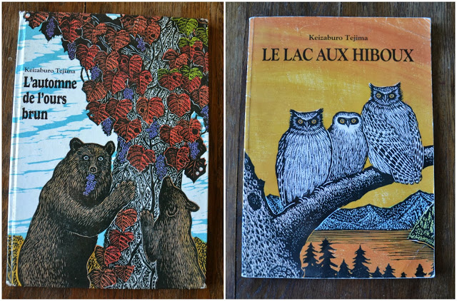 J'ai également trouvé un livre de Keizaburo Tejima, un japonais (né en 1935) qui réalise des gravures sur bois pour des illustrations jeunesse. J'aime beaucoup son travail. J'avais déjà le lac aux hiboux, j'ai trouvé "l'automne de l'ours brun". Du coup je vous montre quelques images de ces superbes livres.