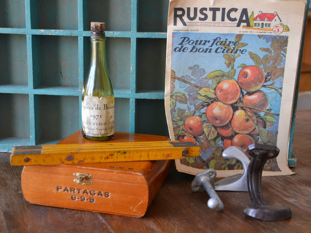 Du vintage en veux-tu en voilà !! Un numéro de rustica, choisi pour l'illustration des pommes. Une ancienne mini bouteille de vin (avec en plus mon années de naissance dessus ;)) Des anciennes patères et les objets aux quels je ne résiste pas : mètre jaune ancien et boîte en bois de cigares.