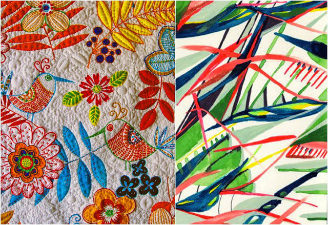 boutis où des broderies sont rajoutées sur des motif de tissu. Une belle idée à faire si j'avais le temps... Une belle
