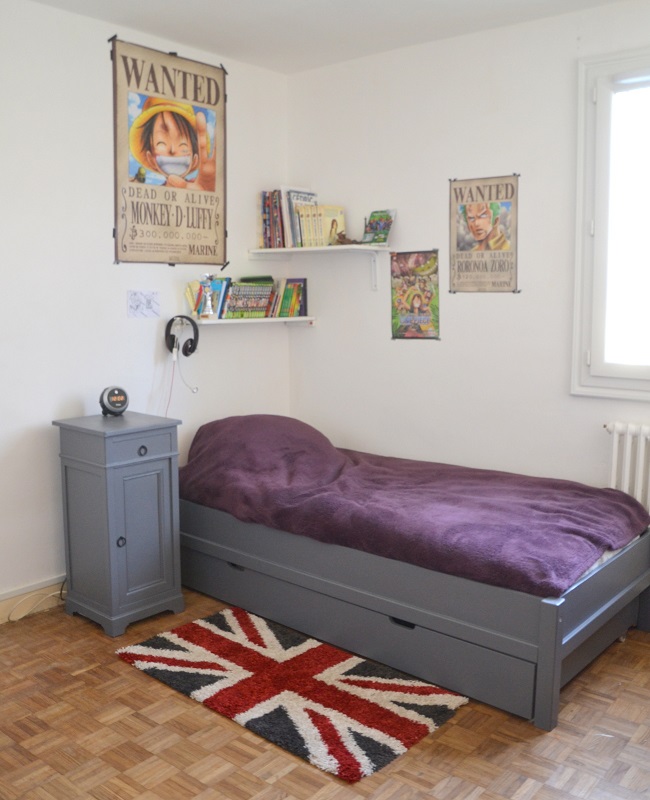 Oui, qu'ont-ils tous avec ce drapeau :) Mais il n'en voulait quand même pas partout, juste une petite touche :) Cela dit c'est ce qu'on voit partout en déco de chambre d'ado, soit cela, soit NY (jaune et noir) donc bon... Pour One piece, oui c'est clair, ça se voit :) Merci de ton passage :)