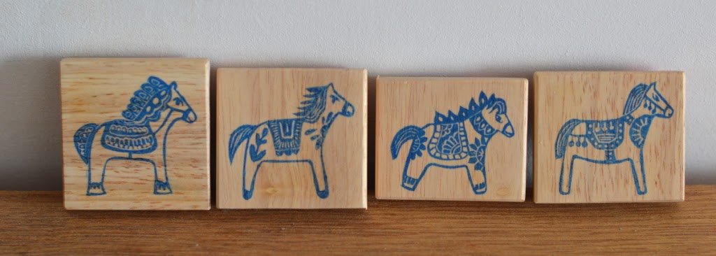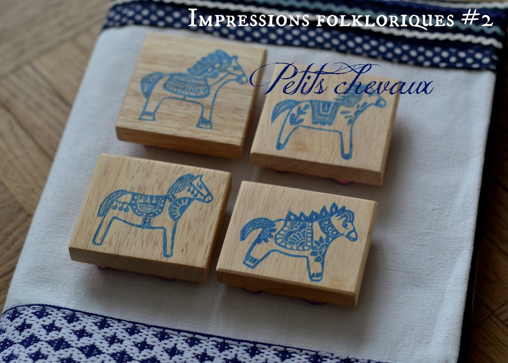 Le 2ème volet (ENFIN !!!) des impressions folkloriques. Je voulais reprendre l’idée, avec quelque chose d’intéressant. J’ai eu l’idée de décliner des chevaux, d’inspirations ethniques diverses. Mes sources d’inspirations ont été principalement des bas reliefs, ou chevaux en bois gravés à la main de l’art populaire de diverses ethnies. J’ai fait des dessins à ma façon, pour une série de plusieurs chevaux en tampons gravés à la main.