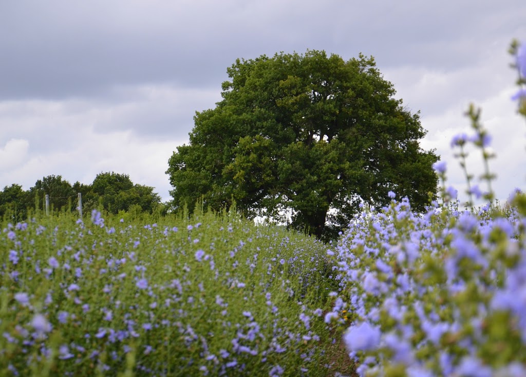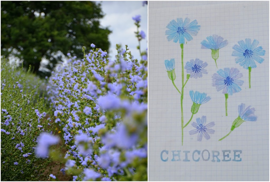 Ce week-end, en balade, j’ai soudain vu une étendue bleue sur le côté de la route. C’était un champ de chicorée cultivée. J’ai arrêté la voiture et pris mon appareil photo pour garder en mémoire cette vue superbe.
