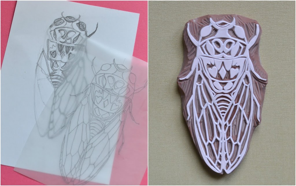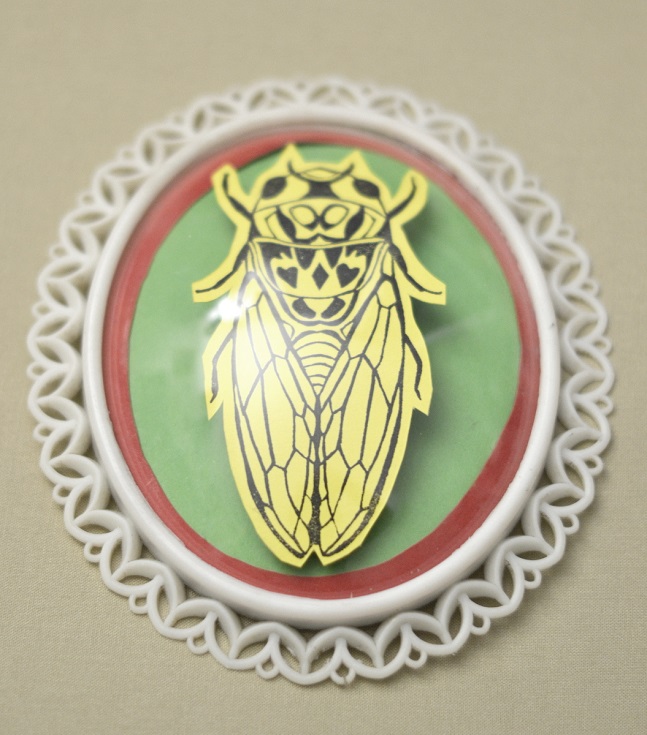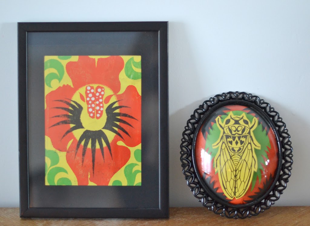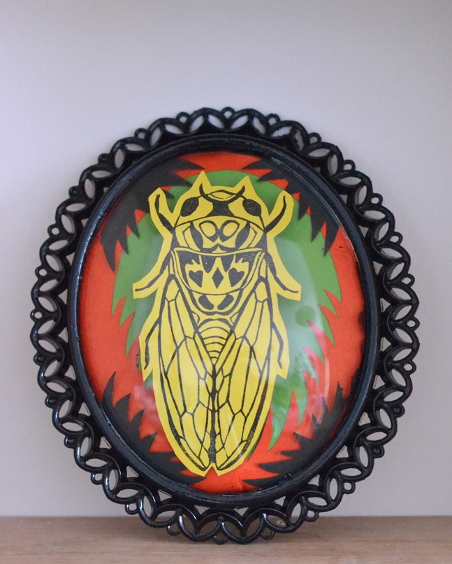 J’ai chiné par hasard des cadres avec verre bulle (bombé) il y a quelques temps. Avec l’encadrement en plastique, et une belle image pieuse de Lourdes dedans. J’avais une envie de tampon « insecte » façon cabinet de curiosité. J’ai donc commencé à graver une grande cigale. Je pensais l’imprimer et puis l’aquareller. J’ai fait des essais plutôt sympas, mais pas très concluants en terme de graphisme. Je trouvais cela un peu fade. J’ai partagé le résultat sur mon instagram ce week-end.
