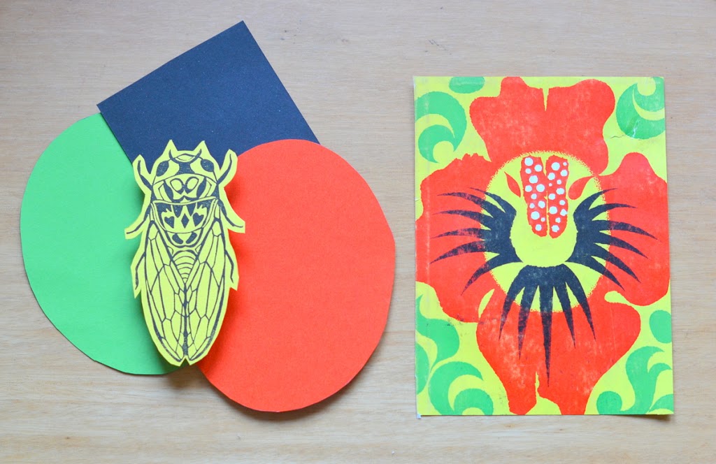 En la voyant, ça m’a donné envie de travailler une composition avec ma cigale en harmonie avec les couleurs de cette fleur d’hibiscus. Du vert, du jaune et du noir pour le contraste. J’ai découpé des papiers, je les ai superposés pour avoir plusieurs plans, et j’ai découpé ma cigale imprimée en noir sur papier jaune, je l’ai relevéer en la collant sur un morceau de liège. L’image en entier rappelle les plans différents en papiers découpés. J’avais ma composition !