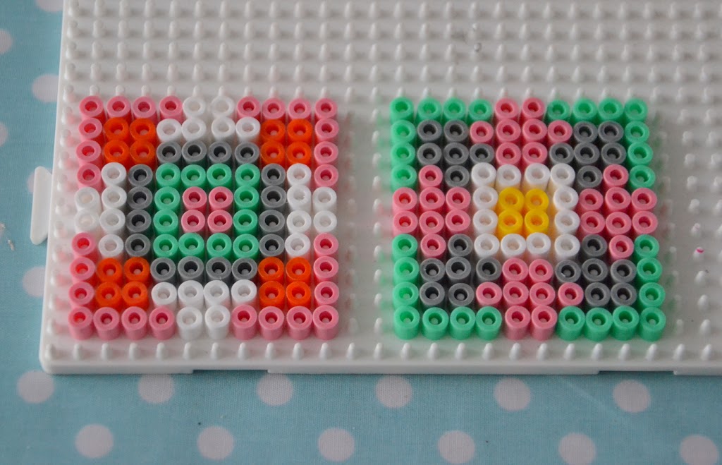 J’adore les perles en plastique à repasser. Mon fils m’avait fait il y a quelques mois un carré de couleur avec ces perles, et j’ai trouvé l’effet « carreau » intéressant. J’ai gardé cette idée dans un coin de ma tête. J’ai un énorme pot de perles multicolores que les enfants sortent de temps en temps (surtout les jours de mauvais temps). En partant d’un carreau de 10 perles de côté j’ai décliné quelques couleurs en formes géométriques assorties.