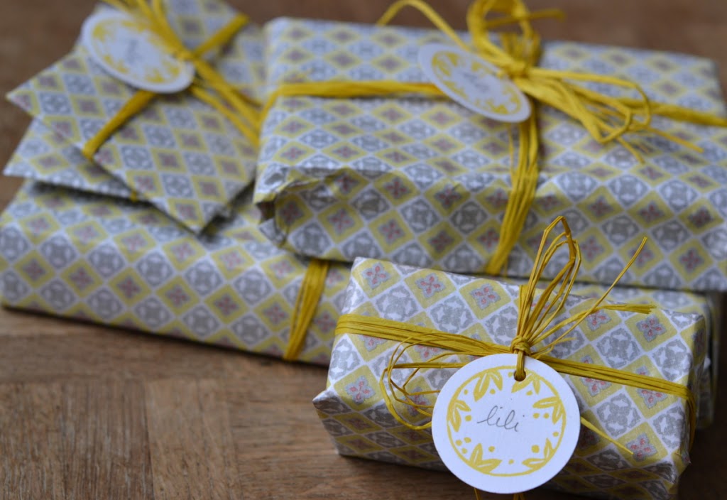 Pour apporter une petite touche personnelle sur les cadeaux, j’ai gravé un petit tampon rond, pour avoir de jolies étiquettes personnalisées sur les cadeaux. J’ai ressorti un joli papier cadeau vintage chiné cet été. Je suis contente de le trouver maintenant 🙂