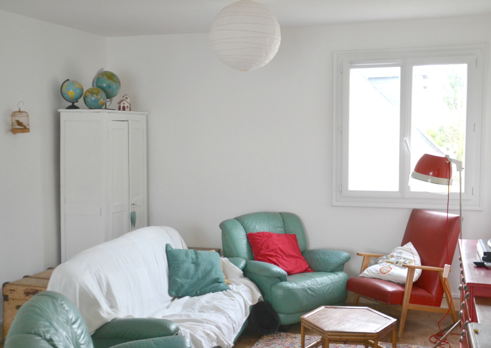 Dans le séjour (un peu en bazar comme quand les enfants s'avachissent sur les canapés :)) Quand on a emménagé, j'avais envie