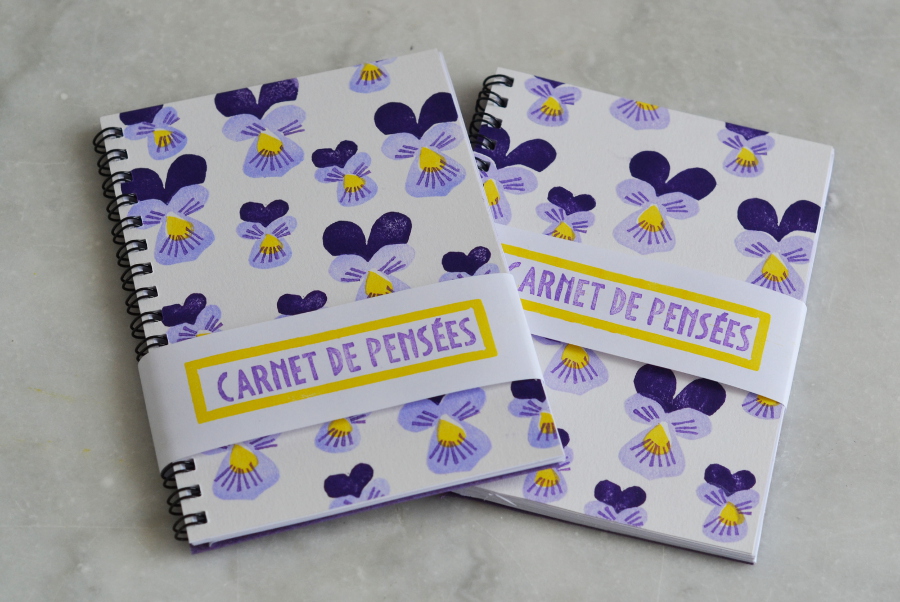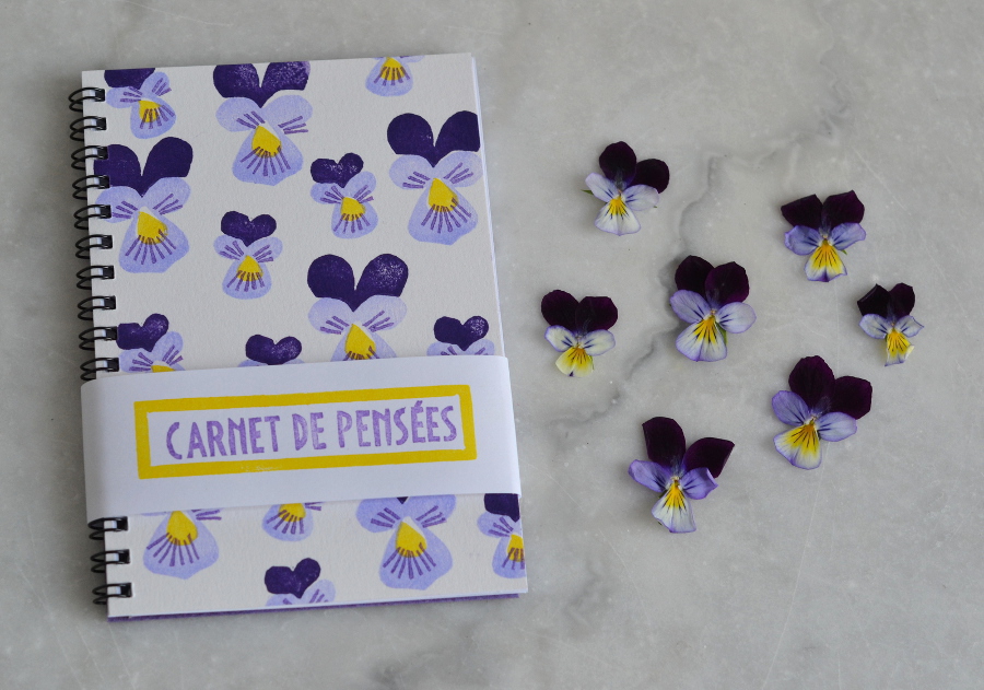 Dans mon jardin, il y a des mauvaises herbes qui poussent trop vite, je dois les arracher pour qu’elles n’envahissent pas mes fleurs. Parfois les mauvaises herbes, sont aussi de jolies fleurs, et quand elles poussent, j’en suis ravie et je les laisse envahir avec bonheur mon jardin. C’est le cas de petites pensées que je trouve si délicates, que j’ai eu envie d’en poser délicatement sur du papier. Quelques croquis, quelques coups de gouge, et j’ai gravé 2 tampons pour imprimer des jolies fleurs sur du papier.