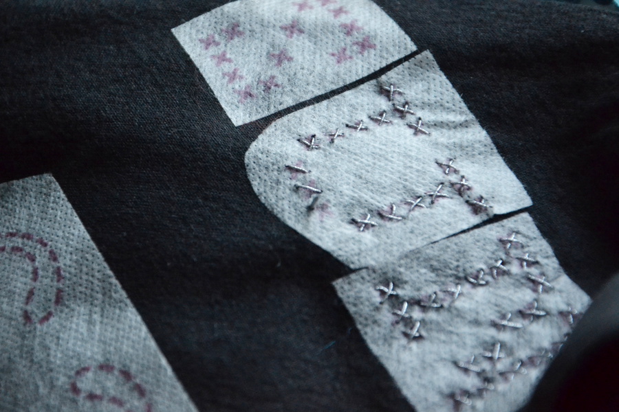 J’ai découpé les motifs que je souhaitais utiliser pour mes réalisations, dans les feuilles autocollantes, puis je les ai collés sur le tissu. J’avais teint en noir des pochons de coton écru pour broder en couleurs fluo. Jusque là tout allait bien. J’ai laissé en plan quelques jours mes broderies et quand j’ai voulu les reprendre, oh surprise les feuilles ne tenaient plus très bien sur mon tissus, flûte ! Je pense qu’il aurait été plus judicieux de ne coller les motifs qu’un après l’autre. La colle et le papier à broder étant faits pour partir à l’eau, je pense qu’en restant à l’air la colle a dû sécher et ne plus adhérer au tissu. J’ai donc du faufiler les motifs pour qu’ils tiennent et une fois cela fait, j’ai pu broder facilement sans soucis.