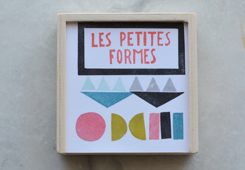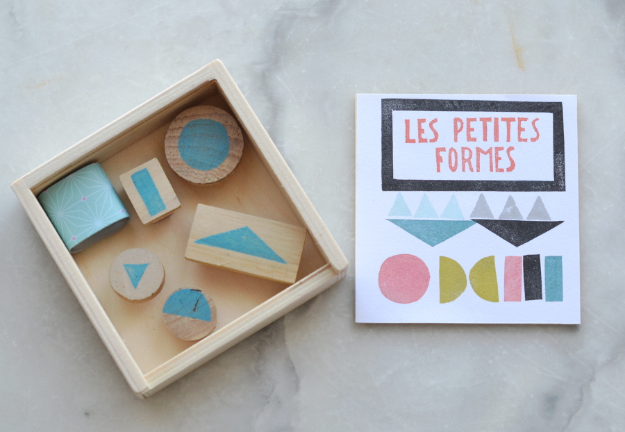 Je vous ai dit cette semaine, que des formes géométriques en tampons pouvaient faire de jolis graphismes. C’est cette idée toute simple qui me trotte dans la tête depuis un moment. Pour la boutique qui ouvre bientôt, j’ai réalisé des petites boîtes avec un assortiment de tampons géométriques, pour réaliser des graphismes à utiliser de multiples façons.
