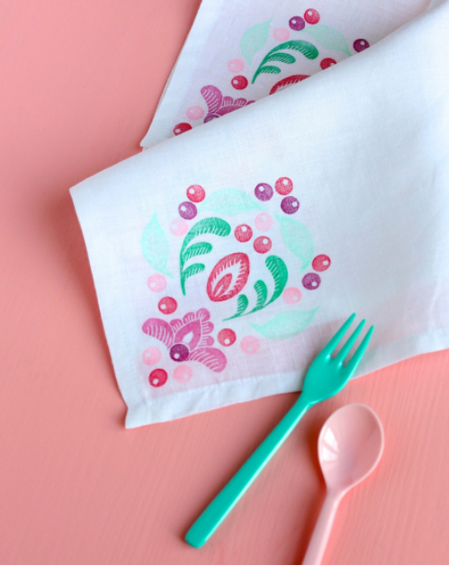 Pour mémoire, celle que j’ai proposée. Ces motifs peuvent se décliner aussi bien sur serviettes en papier, chemins de table, ou même cartes florales à envoyer, car comme dit si bien Sarah, ce qui est génial avec les tampons, c’est qu’une fois qu’on les a on peut les imprimer partout à l’envie !