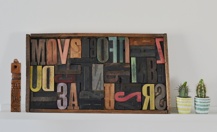 Je commençais à avoir pas mal de caractères d’imprimerie en bois et je ne savais pas comment et où les ranger. Après avoir vu des affiches qui présentaient les lettres les unes à côté des autres, j’ai utilisé un vieux cadre-plateau en bois ancien chiné je ne sais plus où. Et j’ai positionné mes lettres à l’intérieur de sorte qu’elles soient coincées les unes contre les autres.
