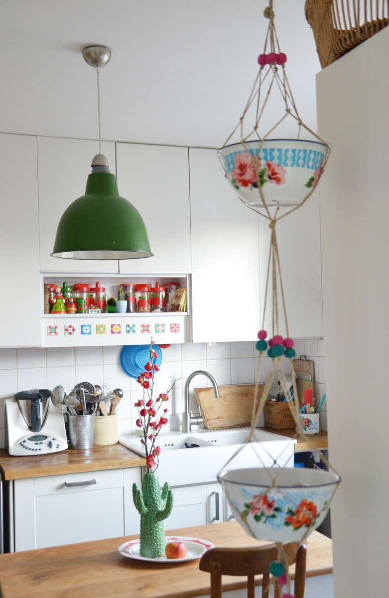 Voilà une suspension réalisée avec des bols vintage en métal émaillé. Les grosses perles sont faites avec de la pâte FIMO. Le modèle de macramé pour la suspension est très simple, j’ai suivi des instructions vues sur le net. Il y a plein de tutos en cherchant un peu.