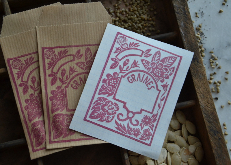 Dans mon livre « Tampons gravés - motifs en voyage » je propose de réaliser un projet de tampon pour réaliser vos propres sachets de graine. On m’a demandé si je vendais les sachets réalisés avec ce tampon. Dans la mesure où le tampon fait partie des projets du livre je ne souhaitais pas l’utiliser.