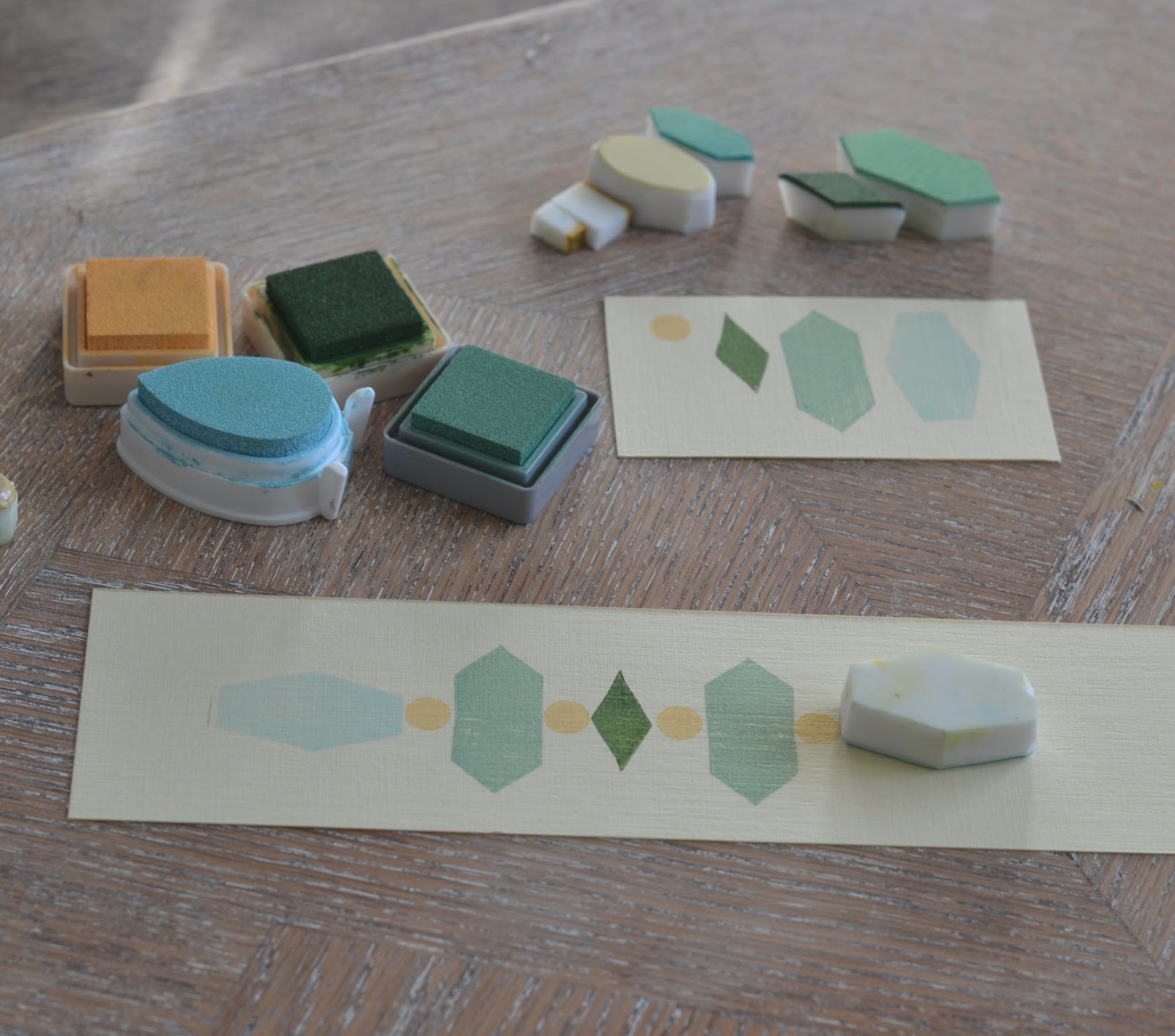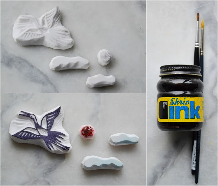 Quelques tampons, un petite touche de rouge (au feutre) sur la tête, de l'encre de chine, et j'avais un dessin sobre façon estampe.