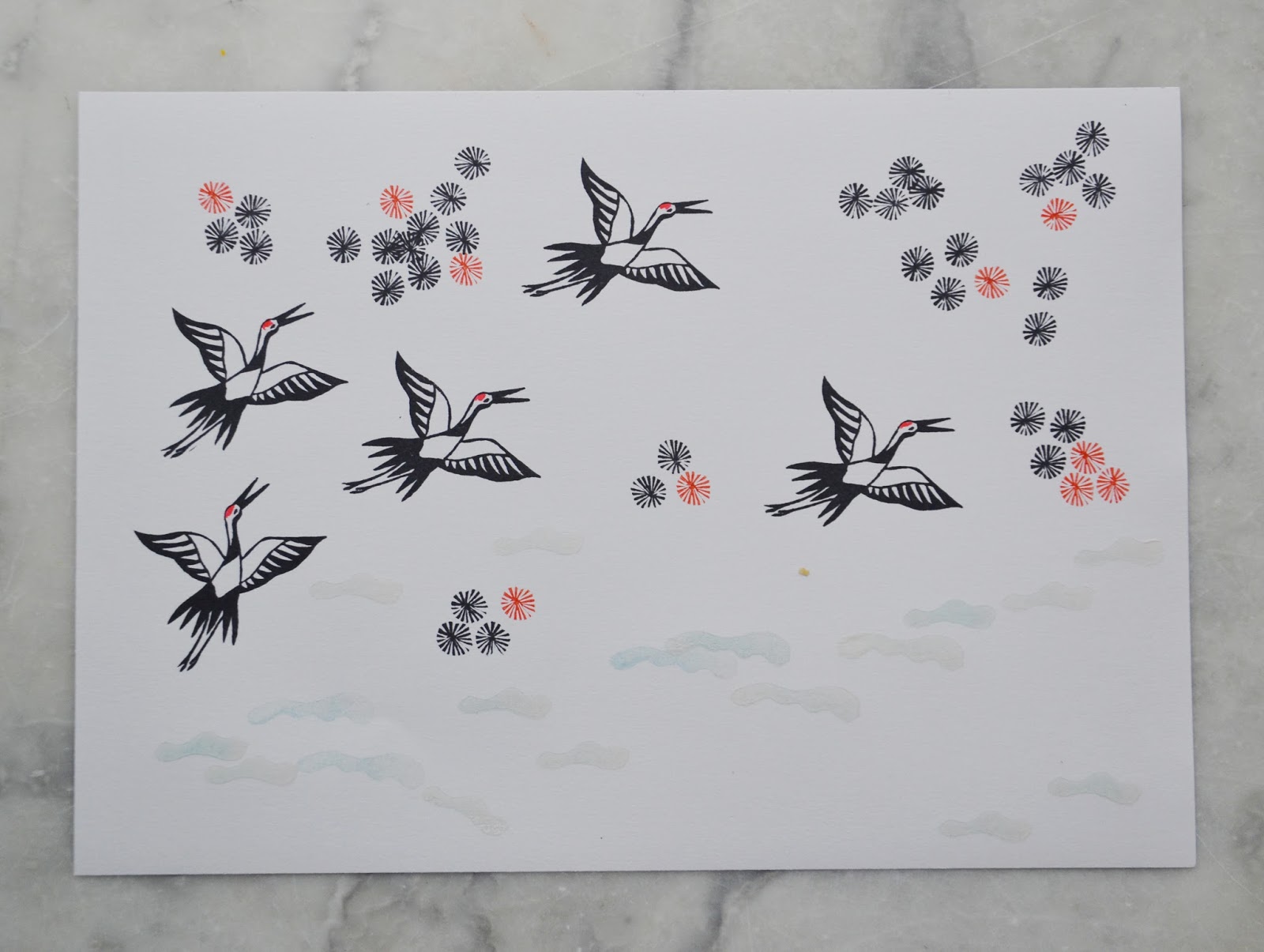 J'ai gravé plusieurs essais de grues du japon, avant de trouver un trait plus simple et élégant, pour représenter ces oiseaux superbes. Elles sont malheureusement classées comme espèce menacée et ne se trouvent je crois, que dans ces zones géographiques. (Sud est de la Russie, Japon et Corée).
