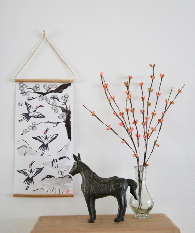 J'ai utilisé des branches de pavots séchés de l'été dernier en guise de bois, pour réaliser le kakémono. Je garde plein de choses qui me paraissent d'un intérêt particulier. Des fois je me dis que c'est pathologique, des fois, comme là, je me dis que ça sert à quelque chose :)