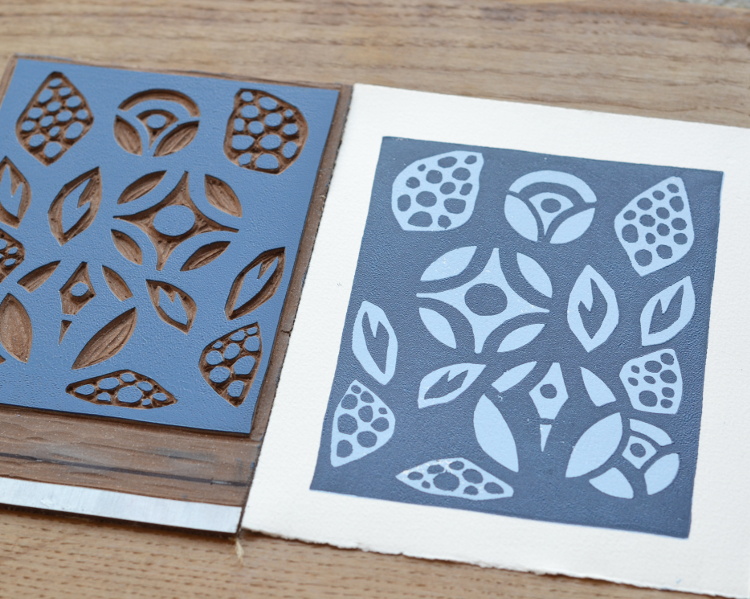 Enfin, la même plaque de lino est gravée à nouveau pour l’impression finale d’une encre dorée typographique (à base d’huile).
