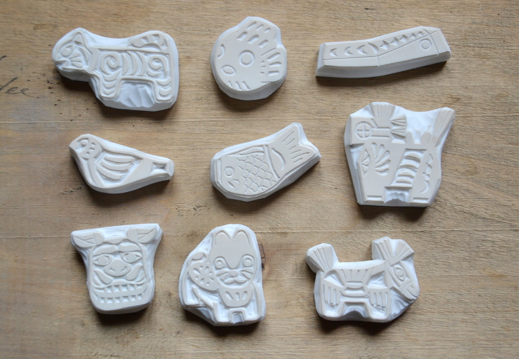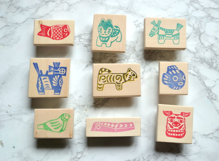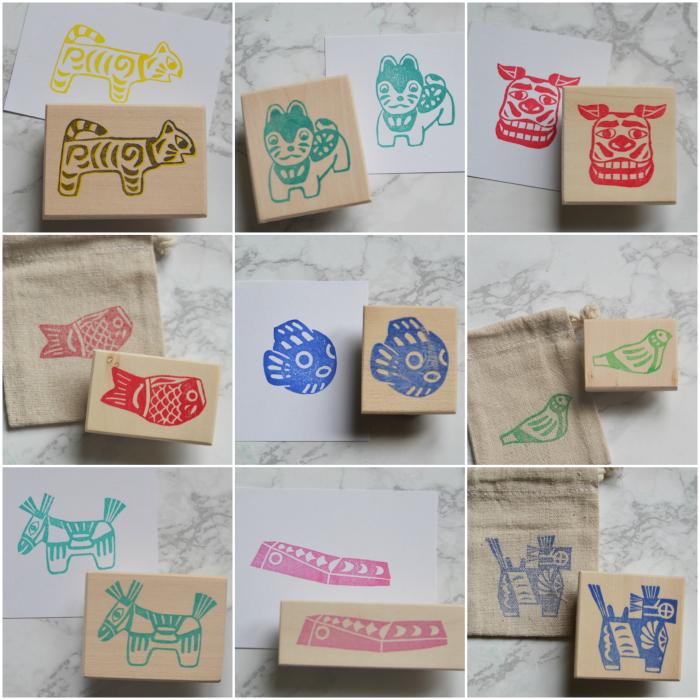 La semaine dernière, je vous montrais mes tirages de linogravures à 4 plaques, sur le thème des figurines de papier-mâché (Hariko) japonaises. A partir de ces petites figurines en linogravure, j’ai réalisé une petite série de tampons.
