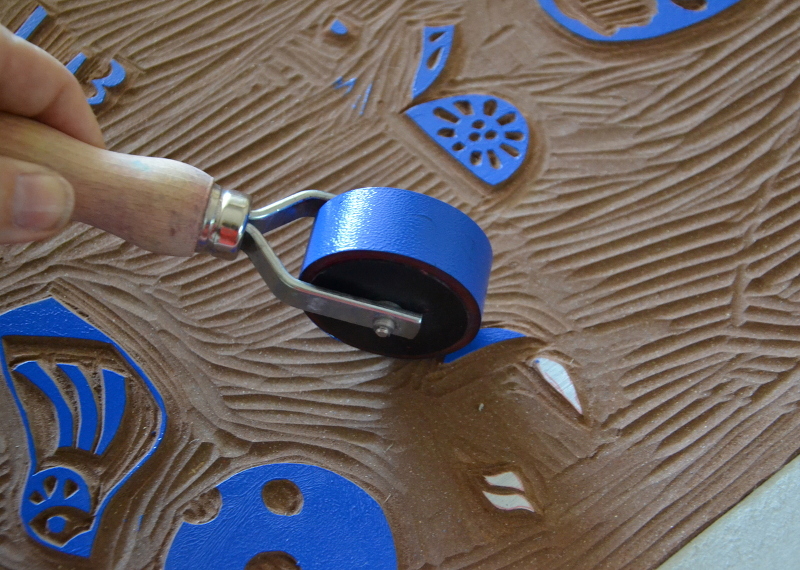 La presse ! Comme je l’ai expliqué, c’est une presse taille douce. Le plateau ne bouge pas quand il n’est pas sous la hauteur du lino. Dans l’idéal il faudrait que j’installe des rails de chaque côté de la longueur du plateau, pour simuler la presse à épreuve. Mais l’insertion de la plaque dans un carton de hauteur similaire fait aussi l’affaire, j’accompagne le plateau à la main jusqu’au début du carton, et le rouleau est ensuite entraîné sur la longueur de la plaque. La difficulté est de trouver la bonne pression. Trop et la feuille est marquée des détails de coups de gouges sur la plaque hors motifs, pas assez l’encre n’adhère pas bien. Et évidemment, pour faire simple, cette pression est différente suivant les couleurs ! J’ai donc 2 tirages de calage obligatoire. Mais une fois le bon équilibre trouvé, c’est un vrai plaisir !