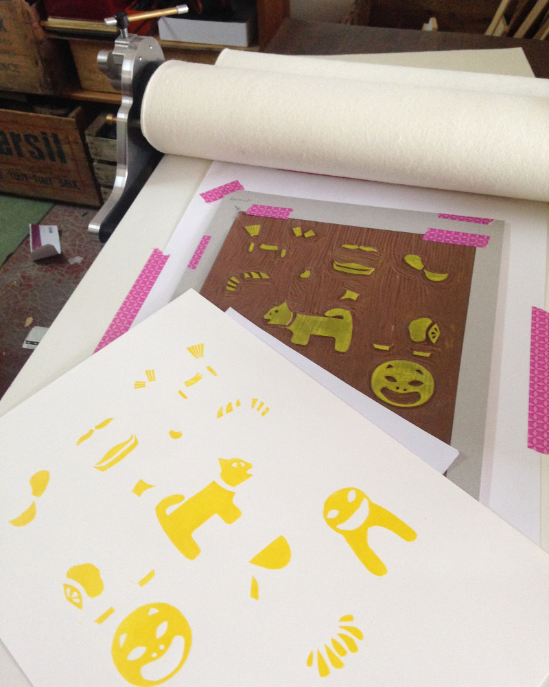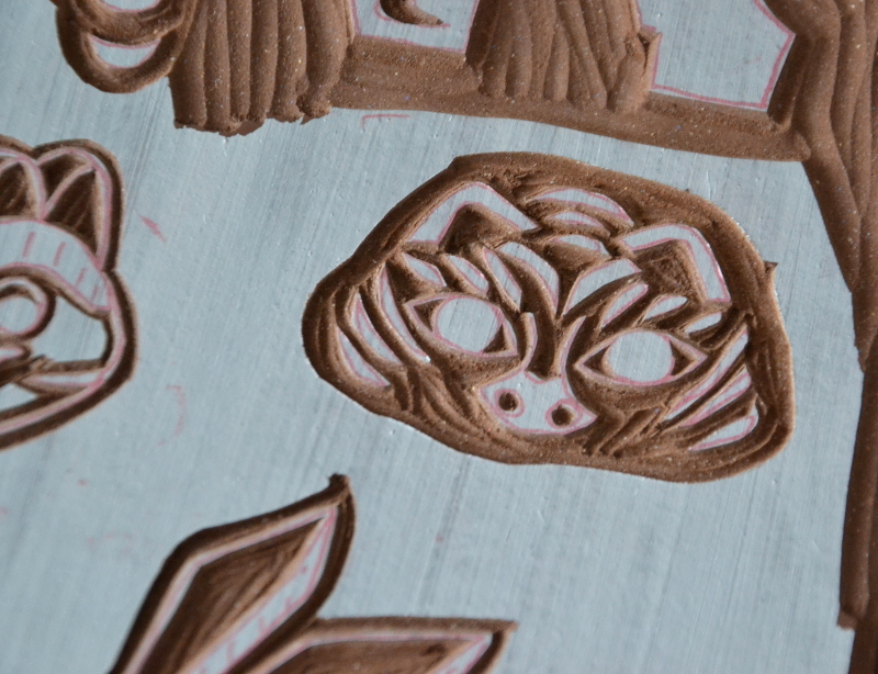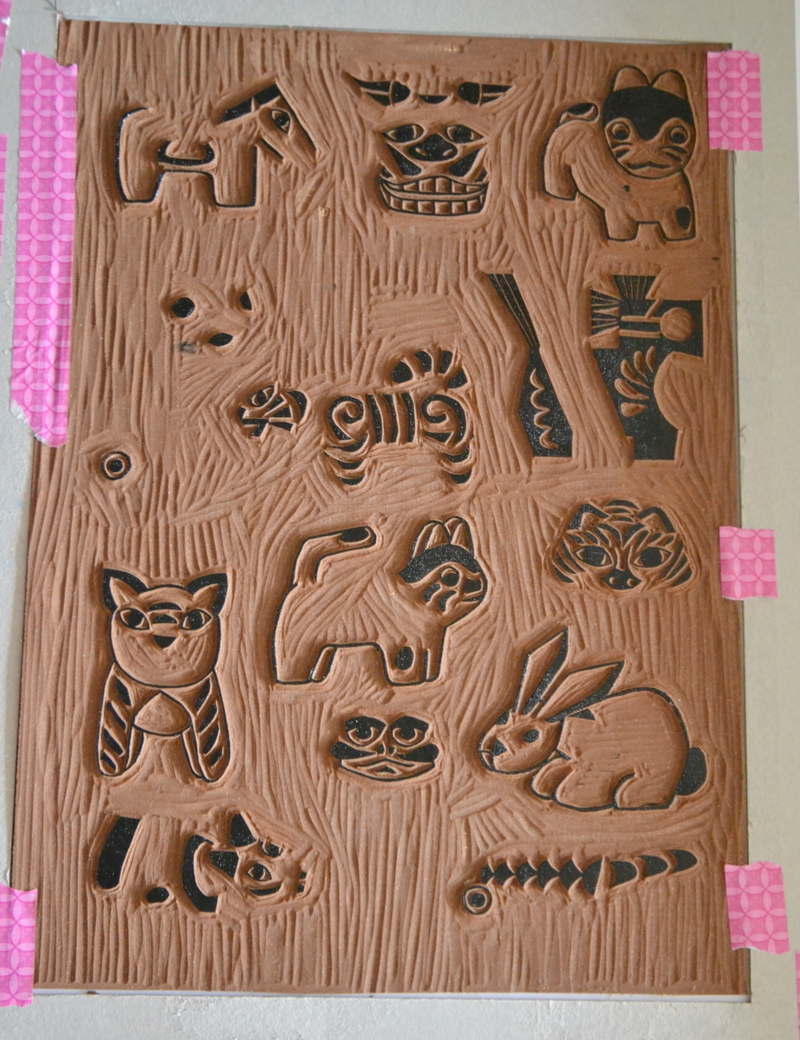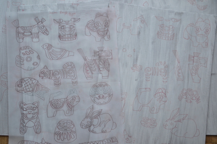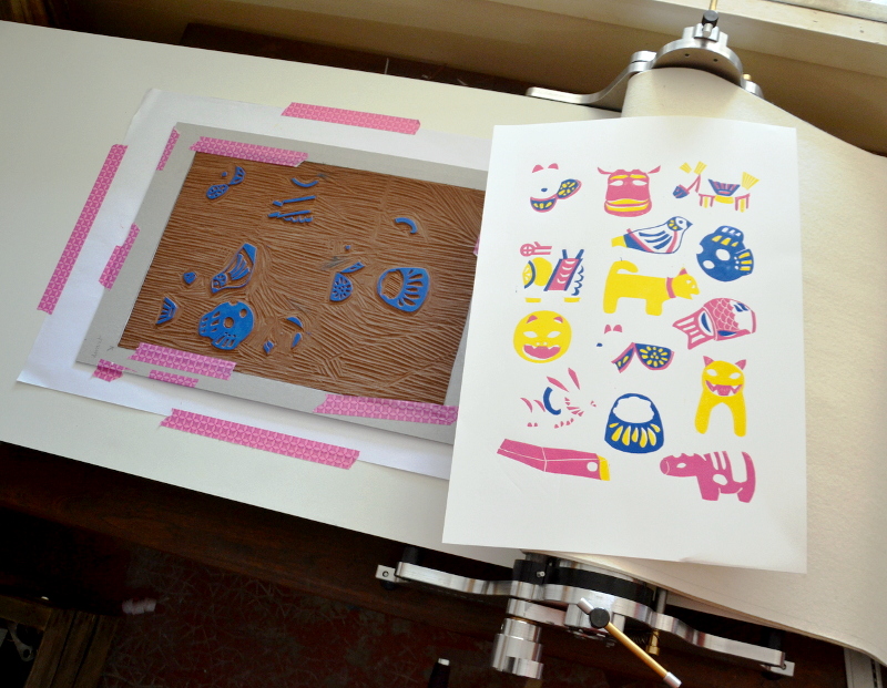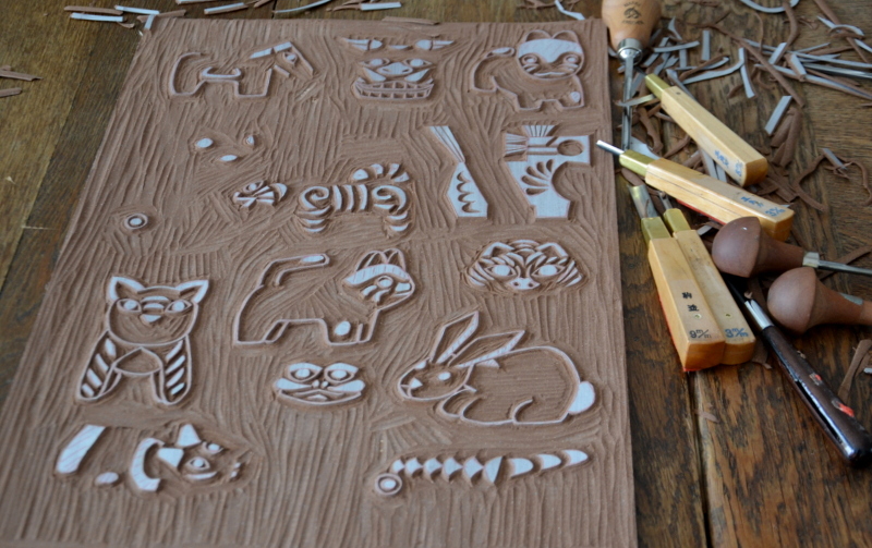 La bête fut commandée il y a quelques semaines, et elle est arrivée ! Il ne me restait plus qu’à la tester. je n’avais pas envie d’utiliser une ancienne plaque pour cela, j’avais envie d’une projet tout nouveau, bien ambitieux évidemment, ne faisons pas les choses à moitié… J’avais fait une linogravure monochrome autour des figurines de Gzhel, je n’en ai pas fait d’articles (ça viendra) mais je l’ai montré sur Instagram. J’avais envie de poursuivre dans l’univers folklorique, et j’ai pensé aux petites figurines japonaises en papier mâché (Hariko signifie papier-mâché en japonais) représentant des petits animaux porte-bonheur, ces figurines sont également utilisées comme des jouets par les enfants, ils revêtent un symbole folklorique fort, les figurines hariko font partie de l’artisanat populaire depuis plus de 400 ans ! Mon choix était fait 🙂