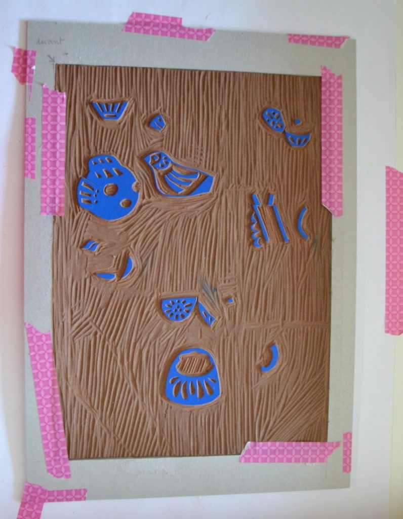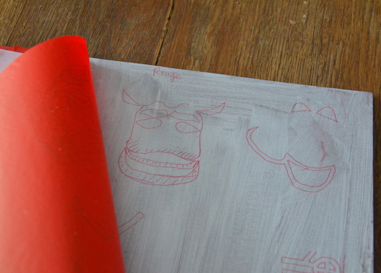 Sur chaque plaque de lino, j’ai décalqué les zones correspondant à une couleur. Il y avait donc une plaque par couleur.