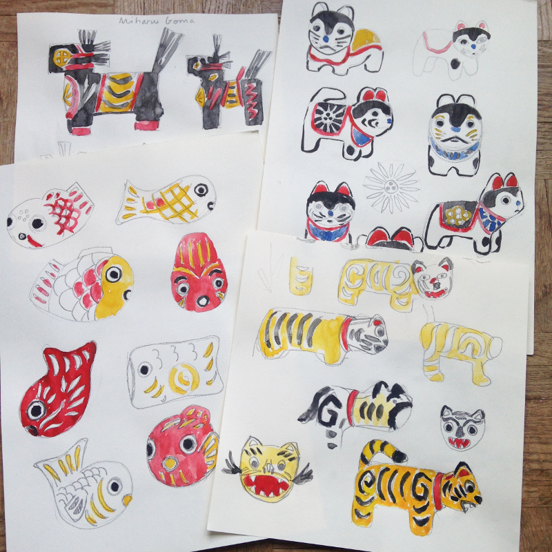 - Miharu goma : petit cheval en bois, dont la légende lui fait avoir sauvé un général shogun Sakanoue Tamuramaro lors d’une bataille, ce petit cheval aiderait donc à protéger les enfants, et représente la vaillance du corps. J’ai également symbolisé le cheval en forme hariko.