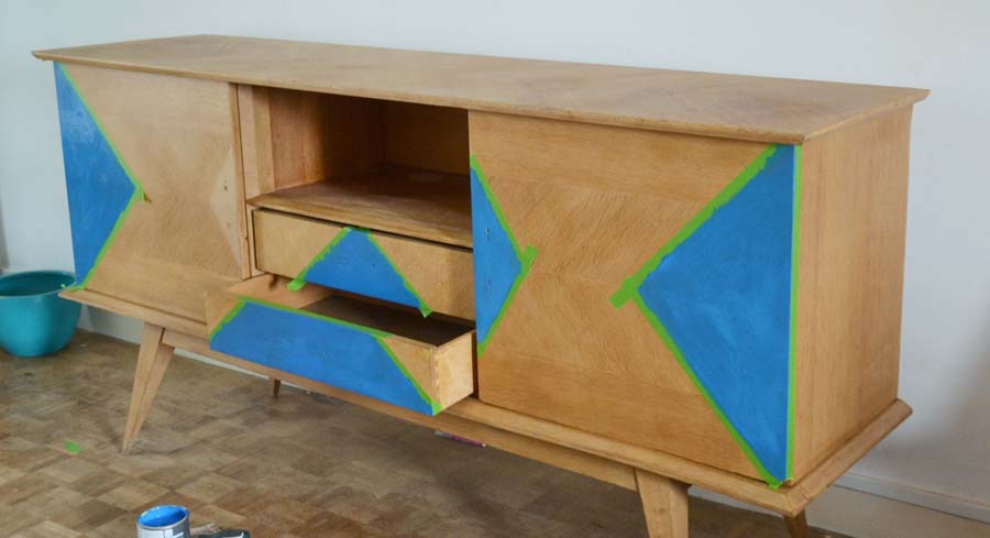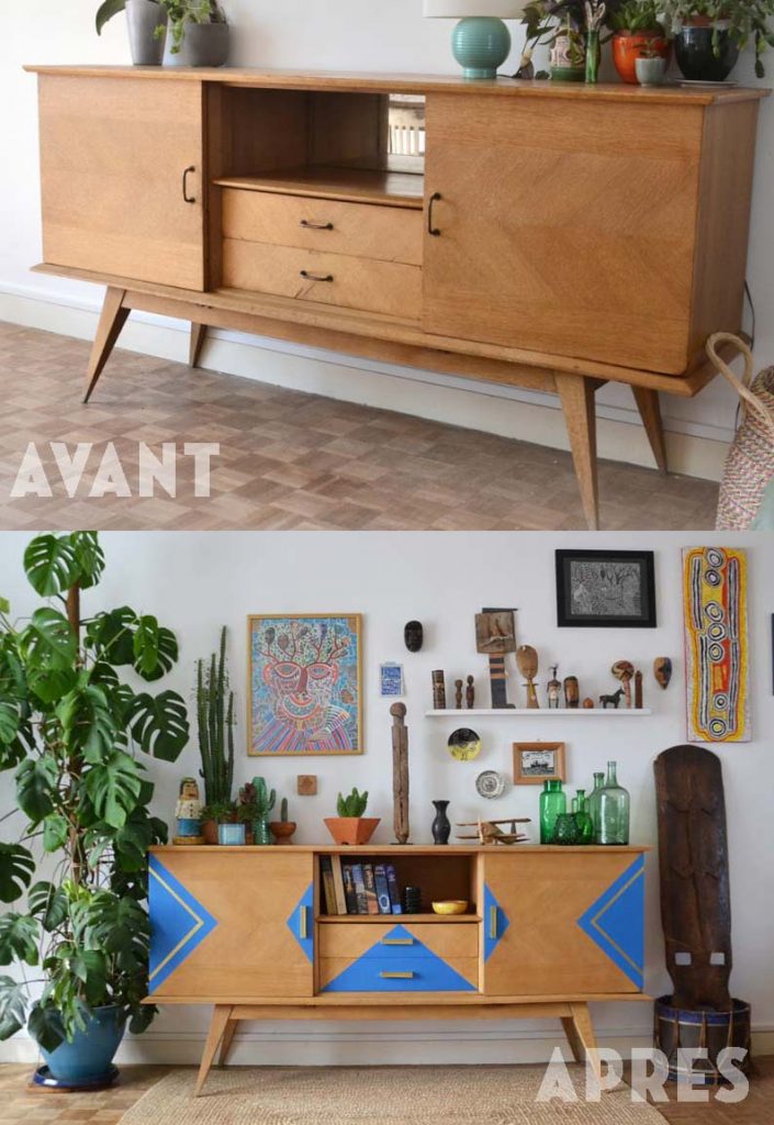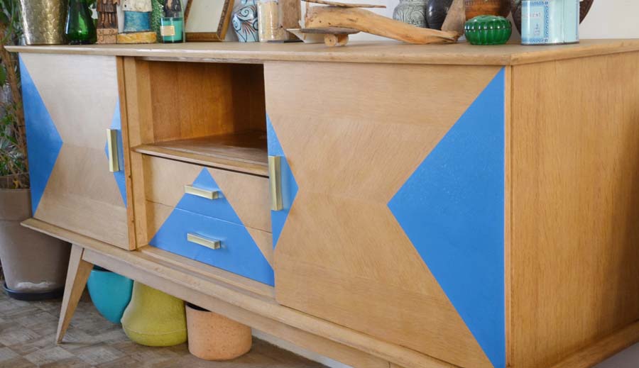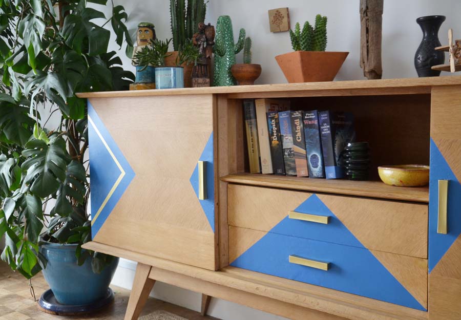Voici le résultat des différentes étapes, ça valait la peine d’attendre, j’adore mon meuble, il a ce côté art-déco, en même temps moderne avec les formes et le bleu vif. Les formes triangulaires font écho aux objets ethniques.