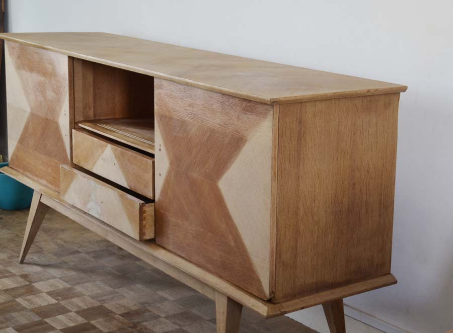 Enfin, oui 4 ans après avoir acheté ce meuble années 60, cette belle enfilade vintage je me suis attelée à sa rénovation et relooking. J’avais acheté le meuble sur le bon coin, pour un prix vraiment dérisoire. Il y avait des petites zones où le placage se défaisait. J’ai recollé et bouché avec un peu de pâte à bois, l’idée était de peindre sur ces parties. Le bois avait été ciré et le jour où nous avions été le chercher il pleuvait beaucoup, de fines taches blanches étaient restées en souvenir… J’ai poncé toutes les parties et verni avec un vernis mat profond transparent pour garder le côté brut du bois.