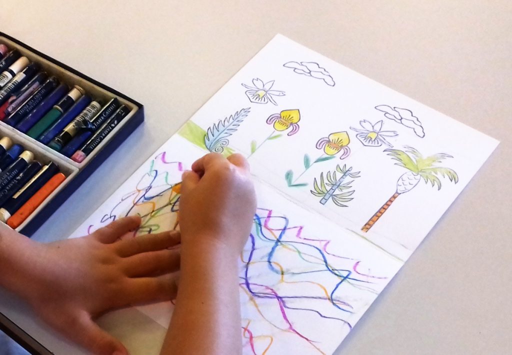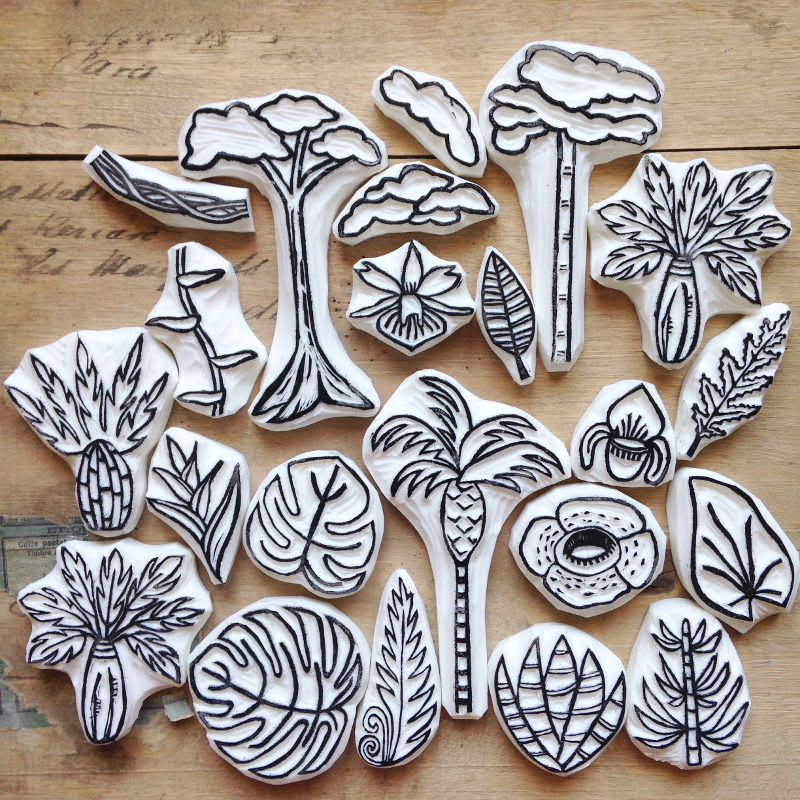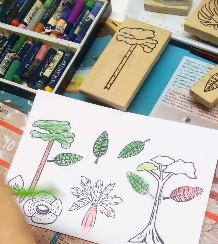 Pour rappel les tampons que j’avais réalisé, il y a les 3 strates de la forêt tropicale représentées, les grands arbres, les fougères arborescentes et les plantes de sol, elles ne sont qu’en contours, pour être coloriées par les enfants